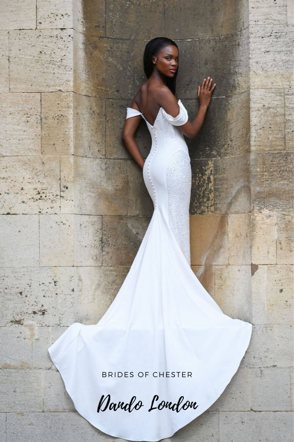The Tintagel by Dando London is an off the shoulder crepe sheath gown. This modern wedding dress features an on trend bodice with beaded peek a boo cowl neckline, as well as beaded side panels on the skirt for added glamour.