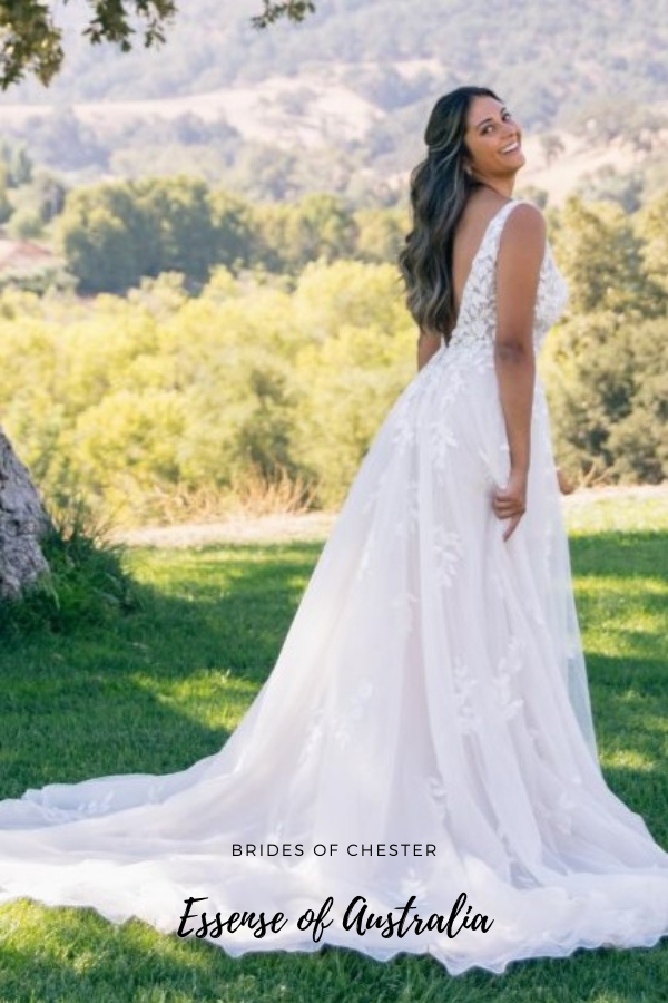 The D3023 by Essense of Australia is a leaf lace, glitter tulle and organza slim A Line gown. This bohemian wedding dress features a semi sheer bodice with a plunging V neckline and a deep V back as well as a frothy train.