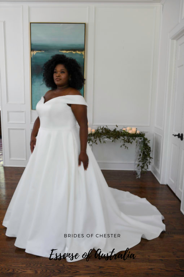 The D3232 Plus by Essense of Australia is a Pearl Mikado ballgown. This classic wedding dress features a sweetheart neckline as well as banded off the shoulder straps and buttons to the end of the train.