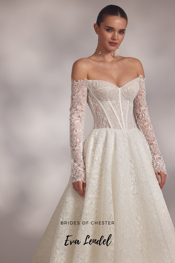 The Abril by Eva Lendel is an allover guipure lace ballgown. This vintage inspired wedding dress features a sweetheart neckline on a bodice with exposed corset detailing as well as off the shoulder long sleeves, a lace up back and buttons to the end of the train.