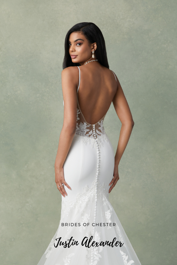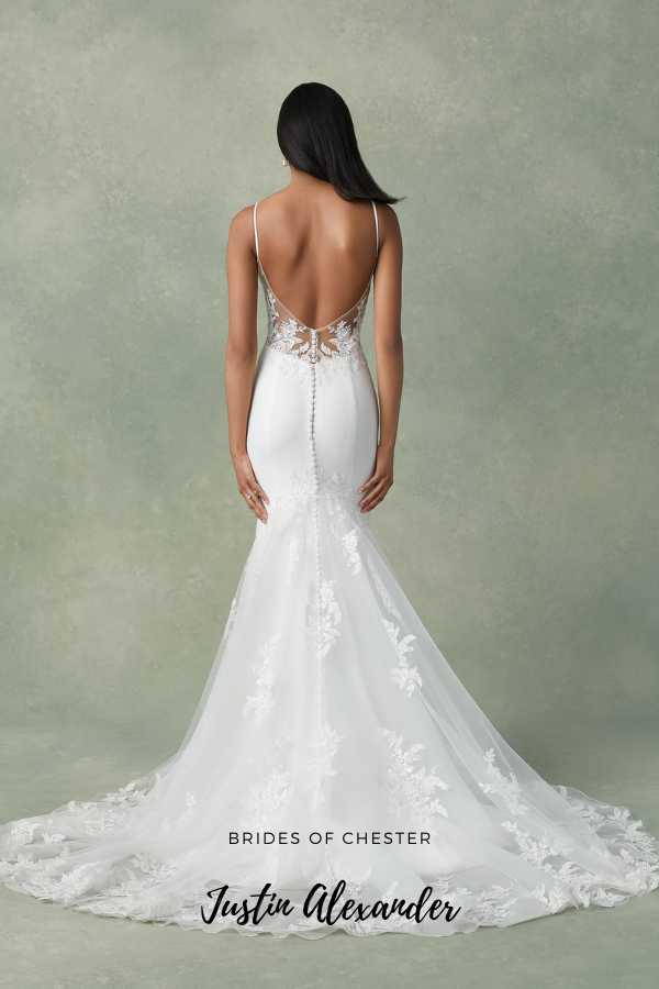 The Fay 88302 by Justin Alexander is a sequinned lace, tulle and crepe sheath gown. This stunning wedding dress features a scoop neckline, shoestring straps and a low illusion scoop back as well as buttons to the end of the beautiful lace train.