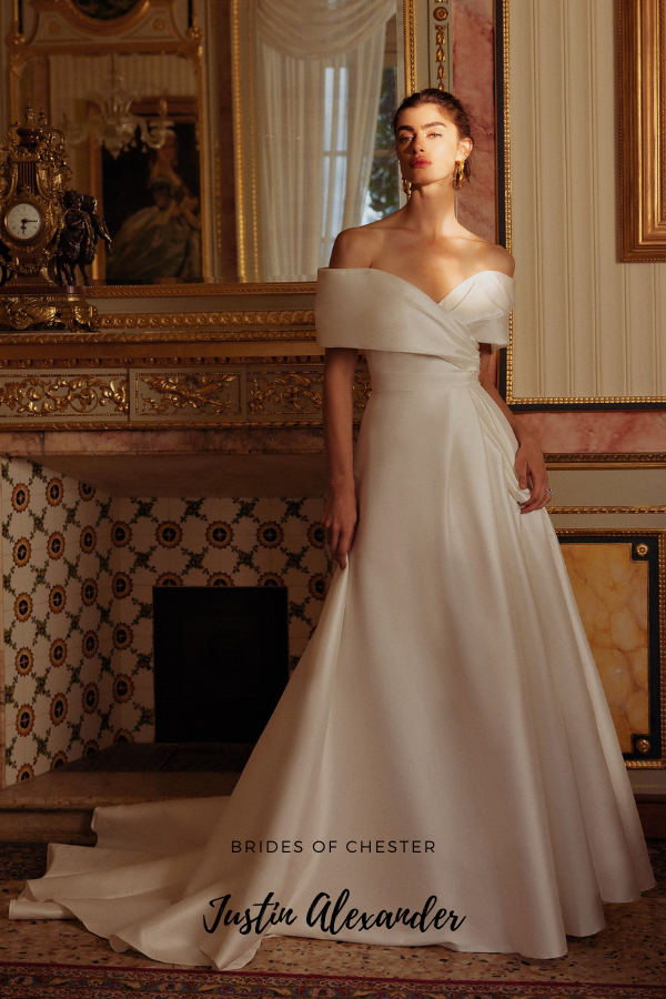 The Harper 88354 by Justin Alexander is a Mikado A Line gown. This modern classic wedding dress features an off the shoulder cuff as well as flattering pleating on the skirt to reveal a sexy slit. The Harper 88354 also has buttons which flow to the end of the chapel length train and pockets!