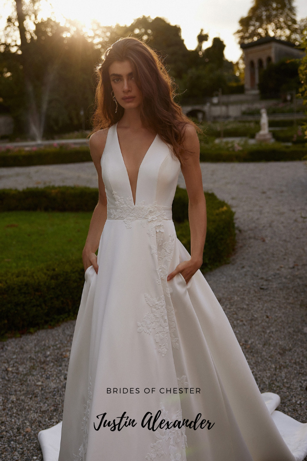 The Idonia 88386 by Justin Alexander is a Mikado and cotton lace A Line gown. This stylish wedding dress features a plunging V neckline, a flattering waistband and a lace illusion back as well as buttons which flow to the end of the chapel length train and pockets!