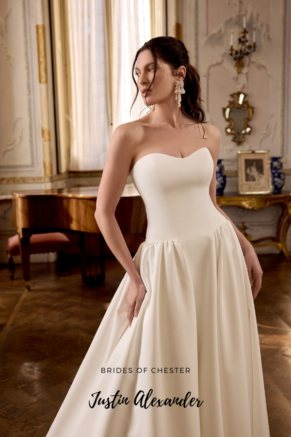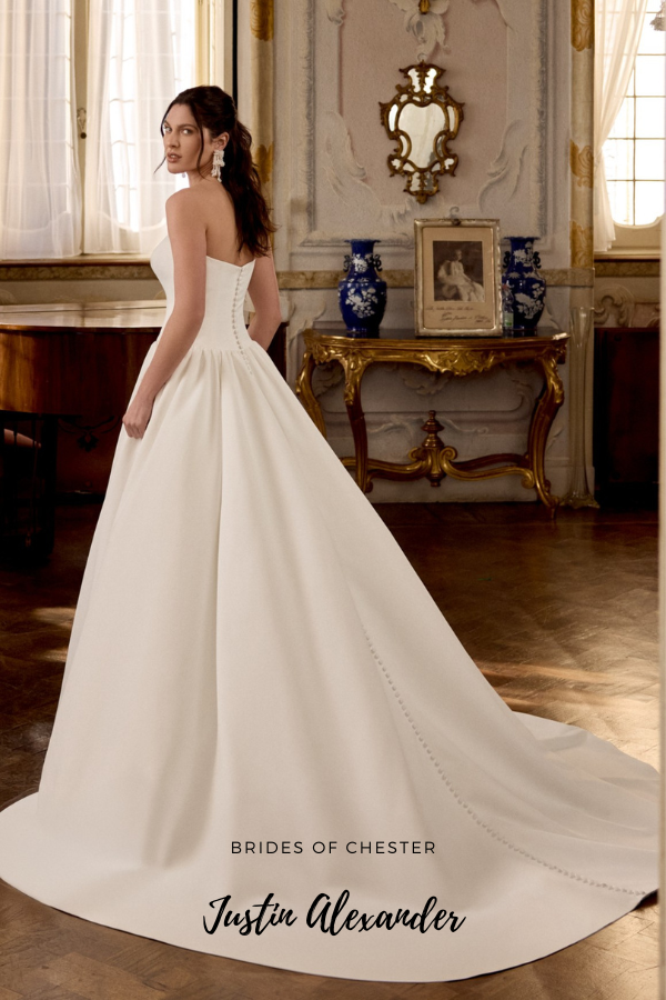 The London 88466 by Justin Alexander is a strapless satin A Line gown. This on trend wedding dress features a soft sweetheart neckline and a dropped waist with flattering detailing as well as buttons to the end of the chapel length train and pockets!