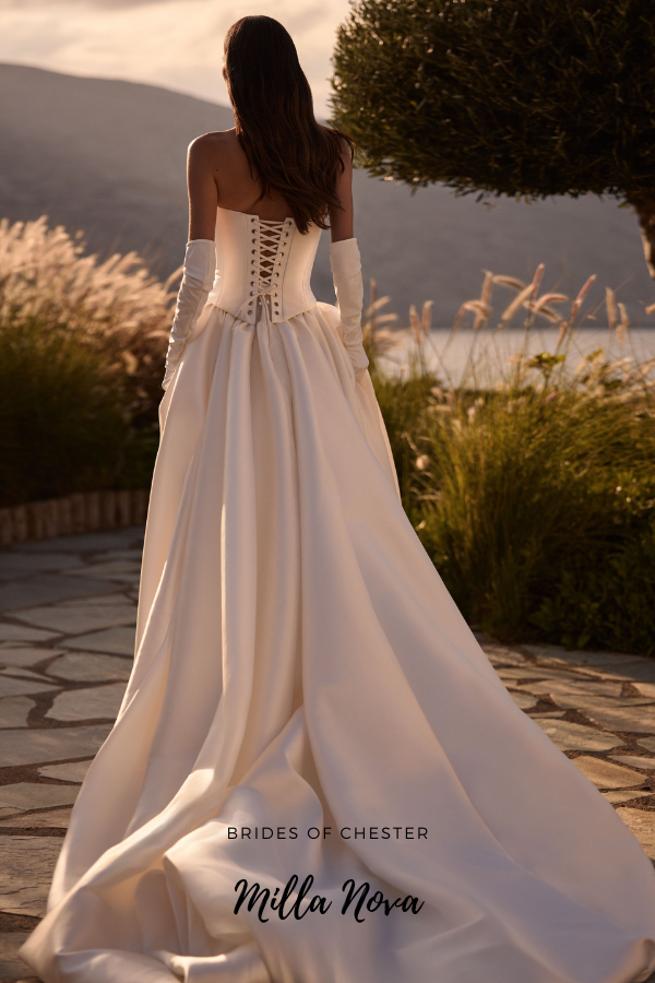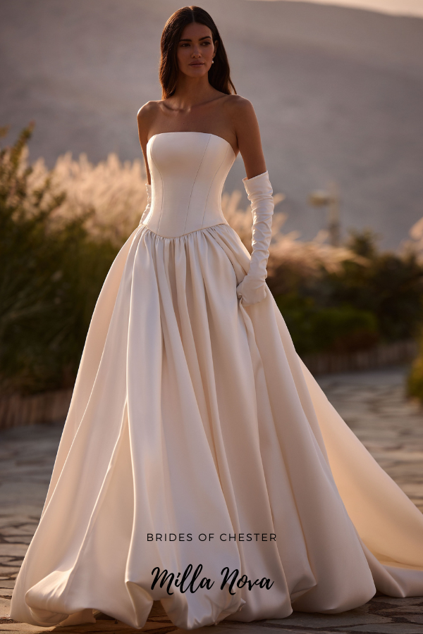 The Aveline by Milla Nova is a luxurious Mikado ballgown. This on trend wedding dress features a strapless neckline on a contoured bodice with lace up enclosure as well as off the shoulder straps, pearl detailing and a dramatic puffball skirt and train.