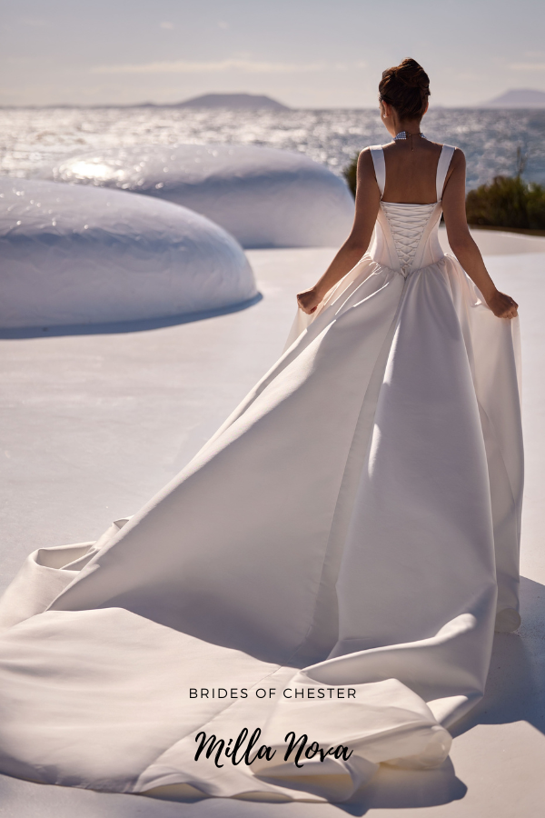 The Whisper by Milla Nova is a lustrous Mikado ballgown. This enchanting wedding dress features a sweetheart neckline with pleated detailing and pretty straps as well as an on-trend drop waist corset bodice with lace up back and a dramatic train.