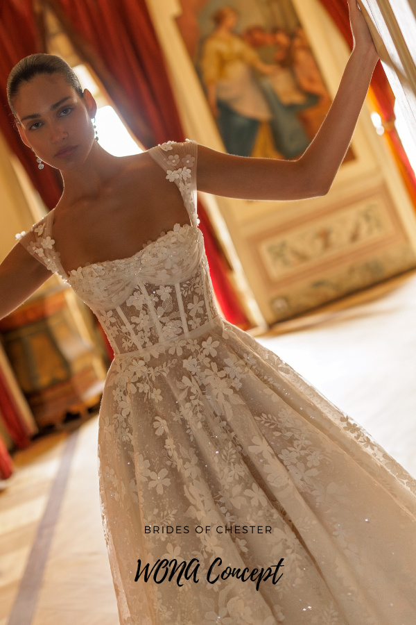 The Piana by WONA Concept is a beaded lace and tulle A Line gown with cap sleeves. This delicate wedding dress features a soft, sweetheart neckline on an exposed corset bodice with lace up back as well as beautiful 3D lace appliques flowing throughout the skirt and onto the train.